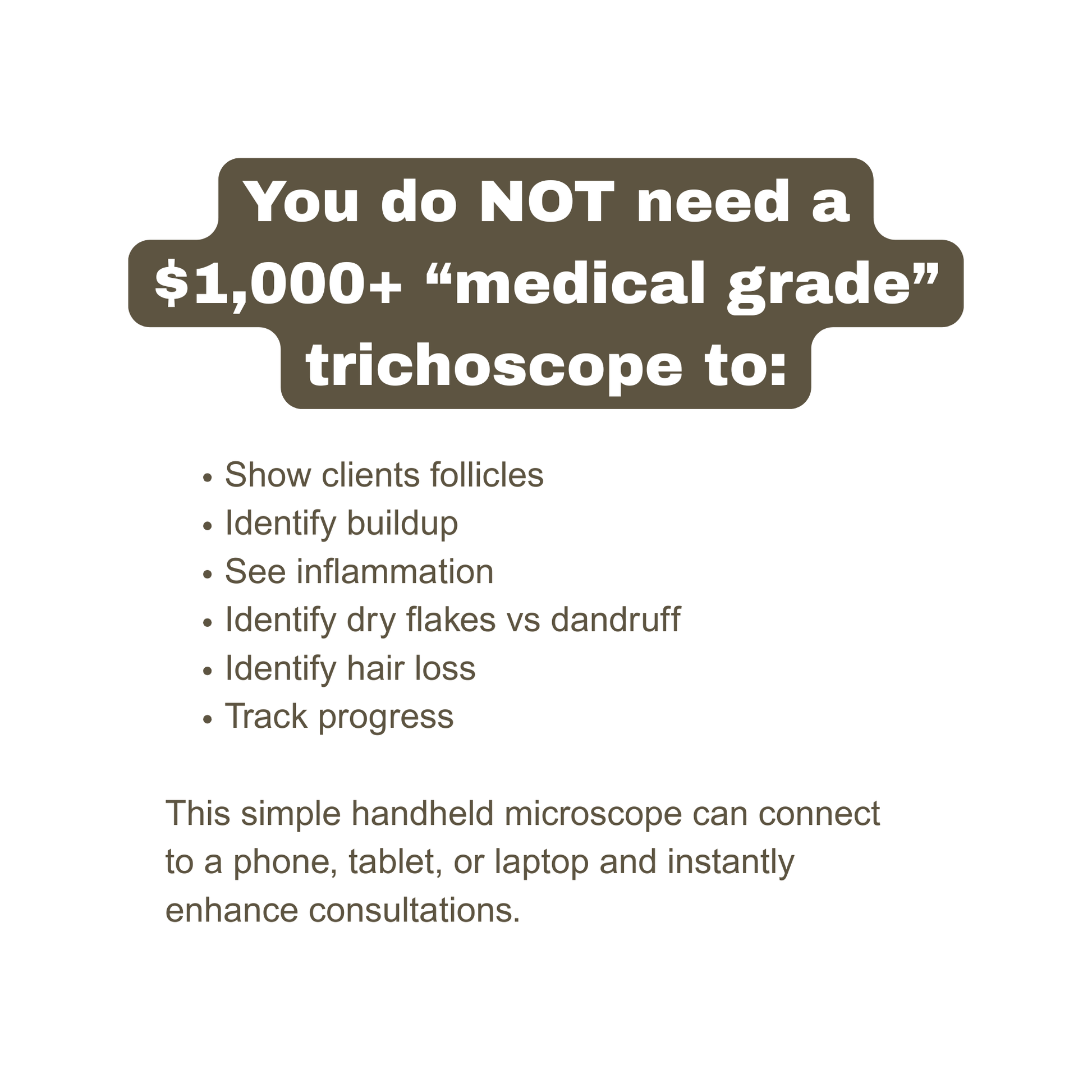 With real-time viewing through your phone, tablet, or laptop, clients can see what you see, instantly increasing trust, understanding, and treatment compliance. This turns your consultations from “educated guesses” into data-driven assessments supported by visual proof.